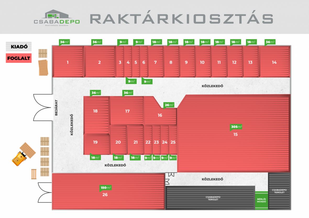 Előregyártott 9-18-36 m2-es fedett raktárhelyiségeink trapézlemezes határoló szerkezettel kerültek kialakításra, az épület aszfaltozott burkolattal rendelkezik. A kisebb (9m2-es) raktárak 1,4 m széles 1 szárnyú, a nagyobb (18- 36 m2-es) raktárak 2,90 m széles 2 szárnyú, zár betéttel ellátott ajtóval lettek kialakítva. Az ajtók bejárati magassága minden esetben 2,3 m, belmagasság 2,2-2,4 m. A raktáregységekben mozgásérzékelős lámpák biztosítják a megfelelő fényviszonyokat az ott tartózkodás vagy rakodás ideje alatt. A Bérlőket rezsi költségek nem terhelik.